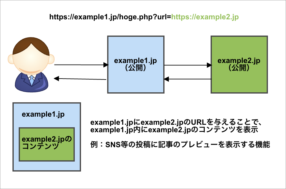 そのときexample1.jpのアプリケーションにSSRF脆弱性があると、与えられるURLにプライベートIPアドレスやイントラネット用のFQDNを指定された場合に、本来アクセスできないデータにアクセスされ情報漏洩につながるケースがあります。
